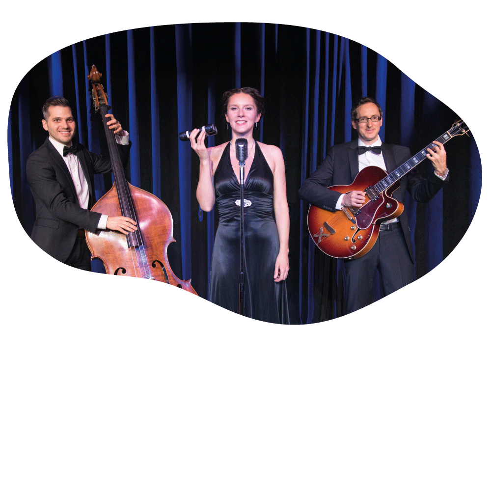 Guitare, contrebasse et voix dans un répertoire dynamique et joyeux. Des classiques du jazz et de la chanson française avec des rythmes swing et une touche de douce flûte traversière.